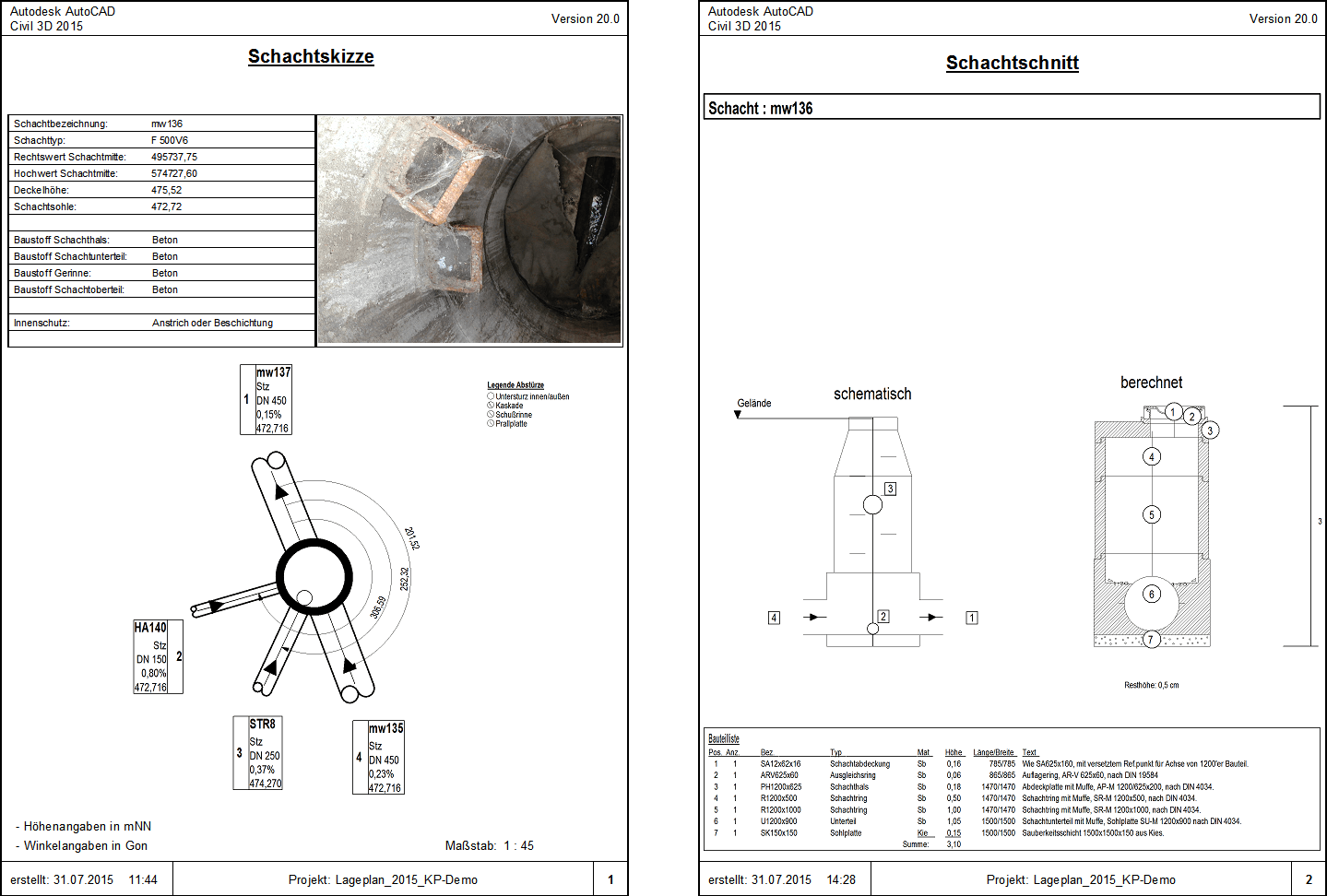 Durch eine hohe Flexibilität in der Anpassung des Formulars lässt sich die Legende nach eigenen Anforderungen anpassen und definieren. Es kann festgelegt werden ob und welche Schachtschnitte Bestandteil des Schachtmessblatts sein sollen. Auch die Bauteil- bzw. Stückliste zum Schachtschnitt ist individuell konfigurierbar.